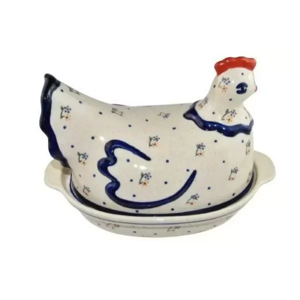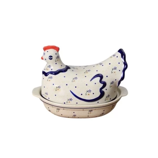 Głęboki półmisek z przykrywką w kształcie kury, malowany ręcznie. Odpowiedni do serwowania ciepłych potraw.