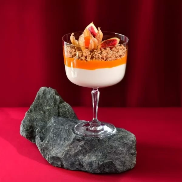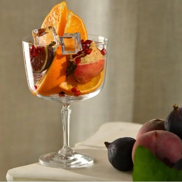Pucharki do deserów z kolekcji Roma. Klarowne ścianki pucharków eksponują warstwy deseru. Wysoka nóżka zapobiega ogrzewaniu dłonią czarki, co jest szczególnie istotne przy podwieczorkach na zimno. Duża pojemność aż 570 ml umożliwia zaserwowanie różnorodnych, składających się z wielu elementów słodkości czy sałatek.