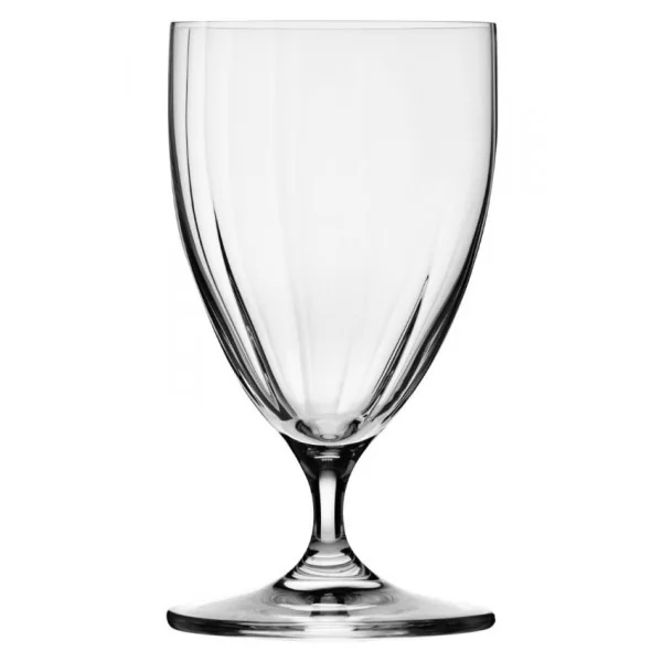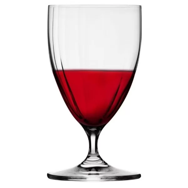 Krótka nóżka Prima Lumi wygodnie leży w dłoni, a same kieliszki mają praktyczną wysokość. Światło padające na naczynie odbija się w subtelnych załamaniach na fakturze krystalicznego szkła, podkreślając barwę wina.
