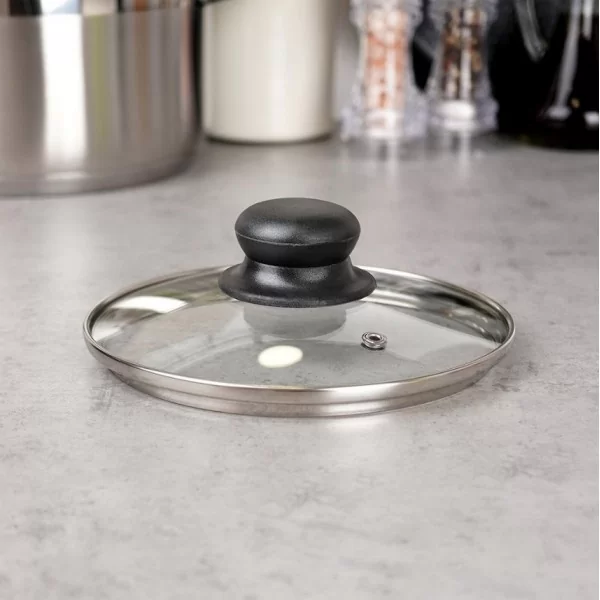 UNIWERSALNA - Szklana pokrywa ze stalową obręczą i uchwytem. Pokrywka ma średnicę 14 cm i wysokość z uchwytem 6 cm. Można ją użyć do pokrycia każdego rodzaju garnków, patelni i rondli w tym rozmiarze.
