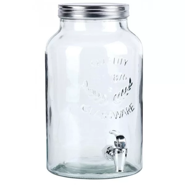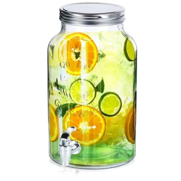 Szklany dystrybutor z kranikiem idealny do serwowania wody, lemoniady, soku, herbaty mrożonej, wody smakowej, ale również ponczu. Dzięki kranikowi w łatwy sposób zaserwujemy ulubione napoje w sposób efektowny. Słój wykorzystamy zarówno w ogrodzie, jak i podczas spotkań rodzinnych. Dzięki zamykanej pokrywie żadne owady nie dostaną się do naszego napoju.