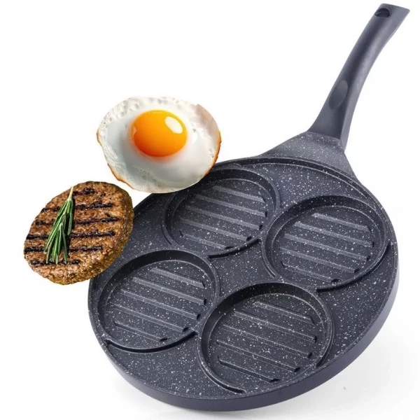 Patelnia grillowa z czterema otworami. Idealna do smażenia kotletów mięsnych, warzywnych oraz rybnych do burgerów. Wykorzystamy ją również do smażenia jajek sadzonych. Dzięki niej przygotujemy pyszne i zdrowe dania, których składniki zachowują swój autentyczny smak i wartości odżywcze. Nieprzywierająca powłoka sprawi, że użytkowanie jej będzie wyjątkowe łatwe a czyszczenie nie sprawi problemu.