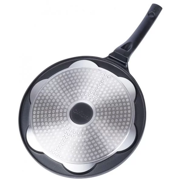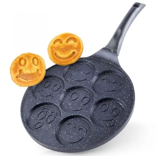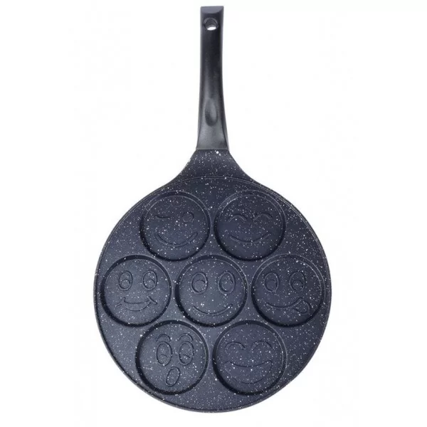 Patelnia o średnicy 27 cm. Przygotujesz na niej pyszne jajka sadzone czy ulubione placuszki śniadaniowe oraz mini naleśniki. Patelnia posiada 7 dedykowanych otworów w których przygotujemy idealne placuszki. Dzięki otworom umieszczonym w patelni możesz mieć pewność, że placuszki usmażą się równomiernie, a powłoka Pfluon granit zapobiegnie przywieraniu placuszków do powierzchni, a także sprawia, że możesz użyć tylko minimalnej ilości tłuszczu do smażenia. Patelnia z powodzeniem sprawdzi się także do przygotowania jajek. Doskonałe przewodnictwo materiału eliminuje straty ciepła, a tym samym pozwala to na oszczędność czasu potrzebnego do przygotowania potrawy.