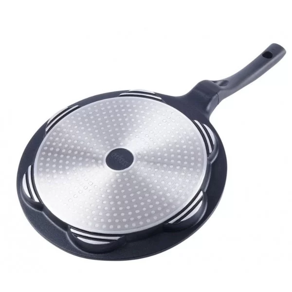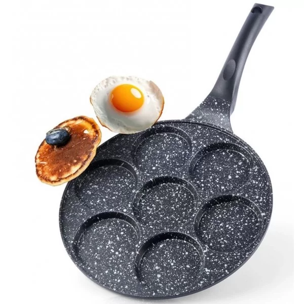 Patelnia o średnicy 27 cm. Przygotujesz na niej pyszne jajka sadzone czy ulubione placuszki śniadaniowe oraz mini naleśniki. Patelnia posiada 7 dedykowanych otworów w których przygotujemy idealne placuszki. Dzięki otworom umieszczonym w patelni możesz mieć pewność, że placuszki usmażą się równomiernie, a powłoka Pfluon granit zapobiegnie przywieraniu placuszków do powierzchni, a także sprawia, że nie musisz wykorzystywać tłuszczu do smażenia. Patelnia z powodzeniem sprawdzi się także do przygotowania jajek.