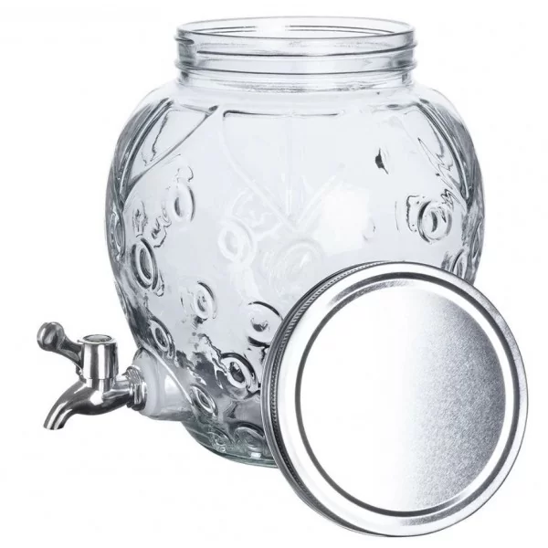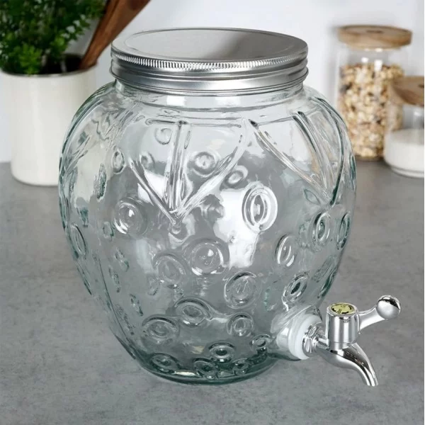 Szklany dystrybutor z kranikiem w kształcie truskawki, idealny do serwowania wody, lemoniady, soku, herbaty mrożonej, wody smakowej, ale również ponczu. Dzięki kranikowi w łatwy sposób zaserwujemy ulubione napoje w sposób efektowny. Słój wykorzystamy zarówno w ogrodzie, jak i podczas spotkań rodzinnych. Dzięki zamykanej pokrywie żadne owady nie dostaną się do naszego napoju.