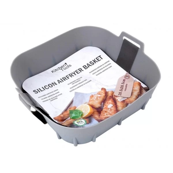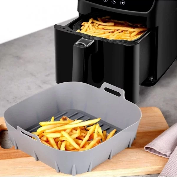Wielorazowy wkład do frytkownicy - Wkład do frytkownicy Air Fryer w kwadratowym kształcie z uchwytami. Wkład jest wielokrotnego użytku i ma wymiary zewnętrzne 20,5 x 20,5 x 7 cm. Średnica dolna wkładu wynosi 18 cm. Wkład jest lekki i łatwy w użyciu - w wygodny sposób umieścimy go w frytkownicy, wystarczy go tylko włożyć do środka.