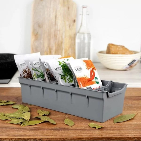 Pojemnik kuchenny na przyprawy w torebkach. Wykonany z solidnych materiałów. Z jego pomocą zapanuje porządek w szafce z przyprawami. Dzięki niemu posortujesz przyprawy i zawsze będziesz mieć dany produkt pod ręką. Szybko znajdziesz odpowiednią torebkę. Pojemnik pozwala utrzymać torebkę w przegródce, co skutecznie zapobiega rozsypywaniu przypraw. Organizer jest pojemny i pomieści wiele torebek z różnymi przyprawami.