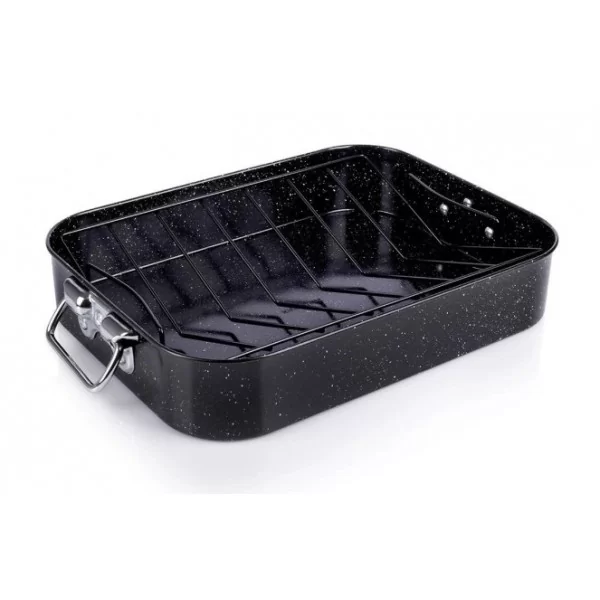 Prostokątna blacha do pieczenia z uchwytami i wyjmowanym rusztem. Wykonana z wytrzymałych materiałów. Łatwa w czyszczeniu i wygodna w użytkowaniu. W brytfannie przygotujemy różnego rodzaju mięsa, świetnie sprawdzi się również jako gęsiarka. Powłoka nieprzywierająca zapobiega przypalaniu się potraw. Brytfanna pomoże przygotować zdrowe i smaczne potrawy w piekarniku.