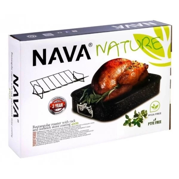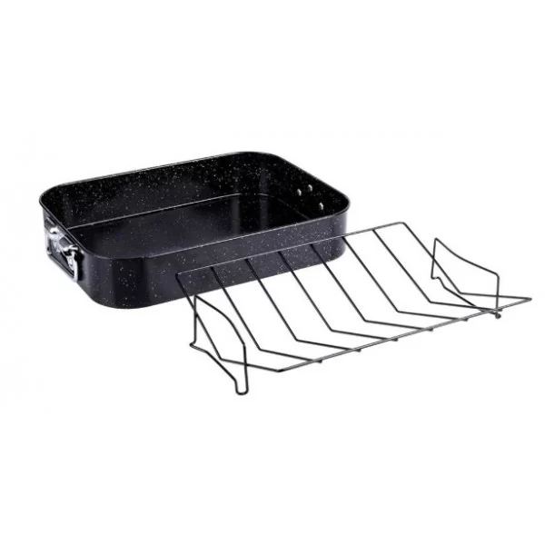 SOLIDNA - Brytfanna została wykonana z najwyższej jakości stali węglowej z nieprzywierającą powłoką granitową. Uchwyty wykonane z ocynkowanej stali nierdzewnej, a ruszt z metalu w czarnym kolorze. Nie zawiera żadnych toksycznych związków - PFOA, PTFE.