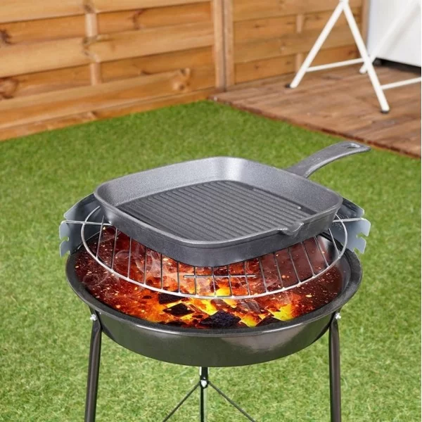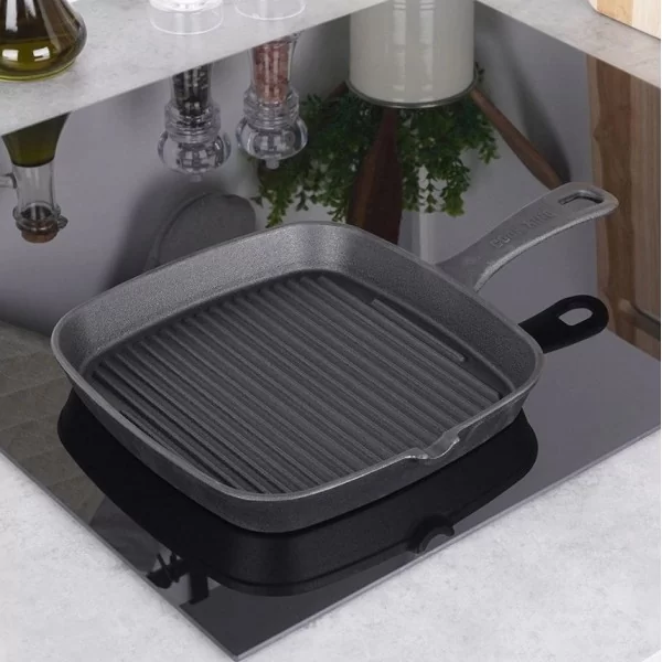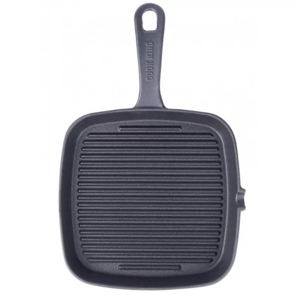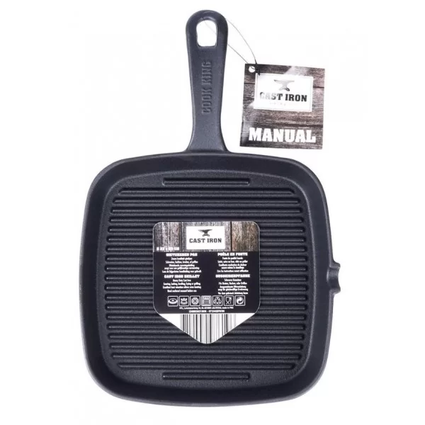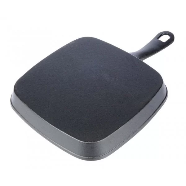 Kwadratowa patelnia grillowa, żeliwna idealna do przygotowywania różnego rodzaju potraw. Możemy użytkować ją w każdej kuchence, ale również bezpośrednio na grillu, czy ogniu. Patelnia jest niezwykle solidna i ciężka. Odpowiednio użytkowana posłuży długie lata. Nie nadaje się do mycia w zmywarce. Żeliwo rozgrzewa się równomiernie i długo utrzymuje ciepło, dzięki czemu serwowane dania dłużej będą ciepłe.