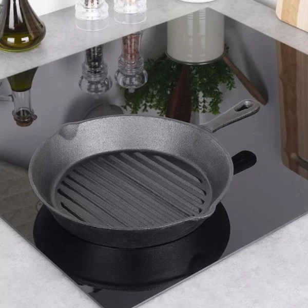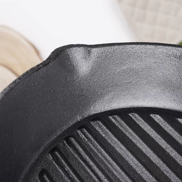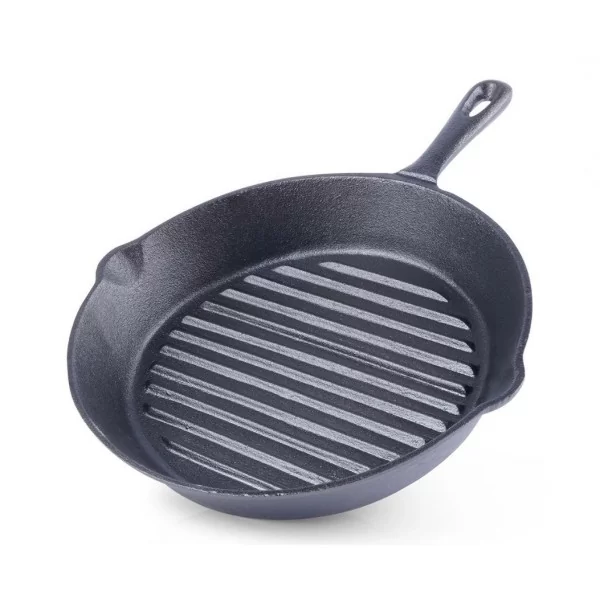 Patelnia grillowa, żeliwna idealna do przygotowywania różnego rodzaju potraw. Możemy użytkować ją w każdej kuchence, ale również bezpośrednio na grillu, czy ogniu. Patelnia jest niezwykle solidna i ciężka. Odpowiednio użytkowana posłuży długie lata. Żeliwo rozgrzewa się równomiernie i długo utrzymuje ciepło, dzięki czemu serwowane dania dłużej będą ciepłe.
