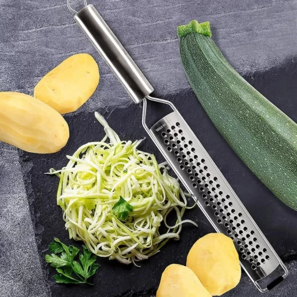 PRZYDATNA - Wygodna, płaska tarka kuchenna o długości 38 cm i szerokości 4 cm. Tarka posiada oczka, które pozwolą trzeć produkty na wiórki.