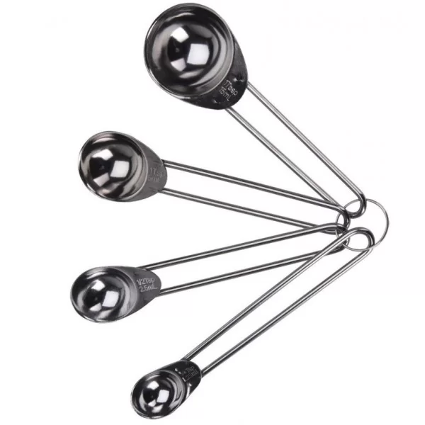 PRAKTYCZNE - Zestaw czterech praktycznych miarek kuchennych w formie łyżek. Przydatne do odmierzenia różnych ilości składników. W zestawie znajdują się miarki o pojemności: 1,25 ml (1/4 łyżeczki), 2,5 ml (1/2 łyżeczki), 5 ml (1 łyżeczka) oraz 15 ml (1 łyżka stołowa).