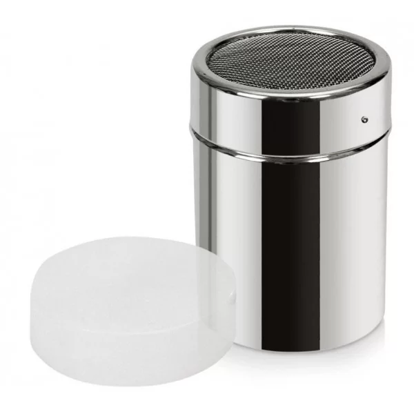 Pojemnik o pojemności 300 ml i średnicy 7 cm z sitkiem i pokrywką. Wykonany z wysokiej jakości stali nierdzewnej a pokrywka z przezroczystego tworzywa. Pojemnik wyposażony jest w gęste sitko, dlatego świetnie sprawdzi się do dozowania dodatków do kawy lub deserów w postaci kakao, czekolady, cynamonu, przypraw, cukru pudru. Wykorzystamy go również jako cukiernicę do łatwego dozowania cukru lub cukru pudru. Zamykana pokrywka uchroni przechowywane dodatki lub przyprawy przed wilgocią oraz pozwoli zachować na dłużej aromat przechowywanych produktów sypkich.