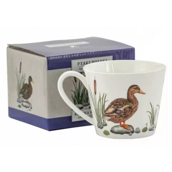 Uroczy, klasyczny biały kubek z serii PTAKI POLSKI firmy MARCO POLO. Wykonany z najwyższej jakości porcelany tzw. porcelany kostnej. Pojemność kubka 400 ml. Cudny kubeczek ozdobiony motywem KACZKI na białym tle.