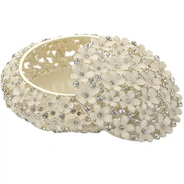 Szkatułkę wytworzono z wysokiej jakości metalu, na zewnątrz poddanego platerowaniu, dzięki czemu jest to produkt trwały i odporny na ząb czasu. Szkatułka jest przepięknie zdobiona. Lekkości nadają kasetce trzy malutkie nóżki. Taką kasetkę warto rozważyć jako prezent na Walentynki czy Dzień Kobiet.