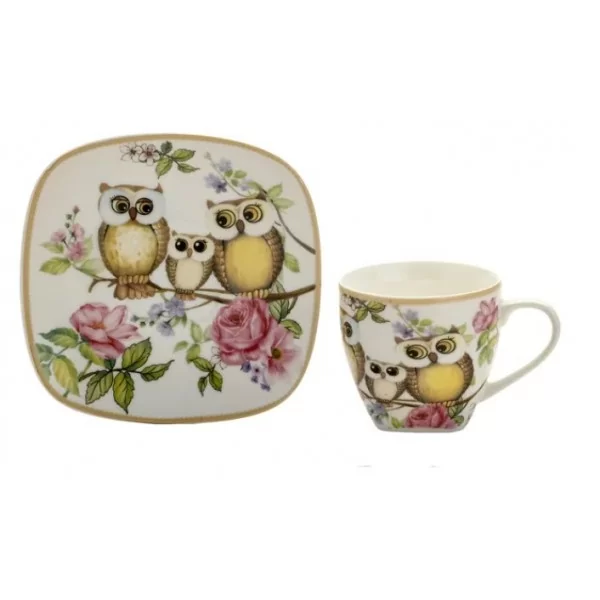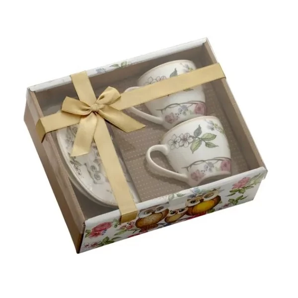 Uroczy komplet filiżanek zdobionych motywem kolorowych kwiatów rodziny Sów .