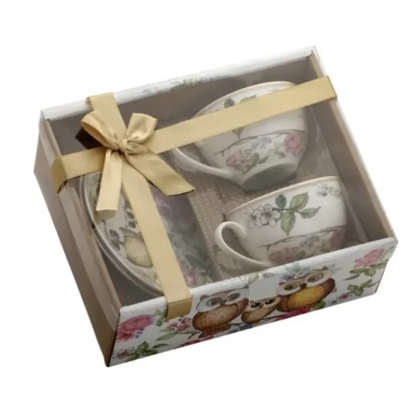 Uroczy komplet filiżanek zdobionych motywem kolorowych kwiatów rodziny Sów .
