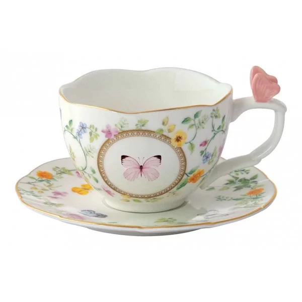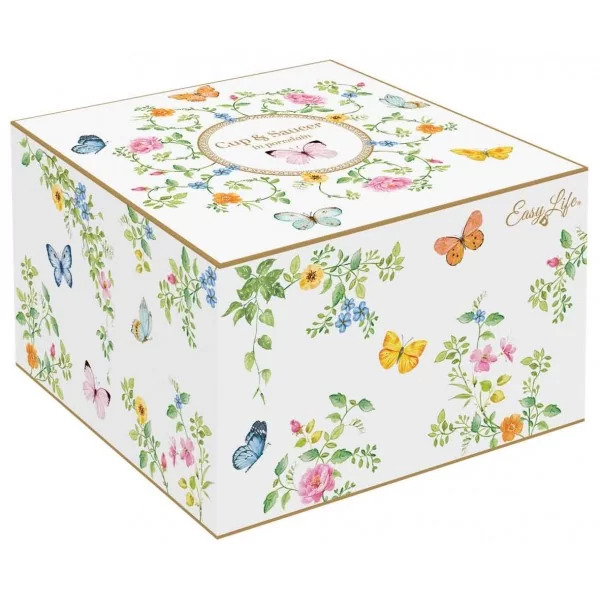 Porcelanowa filiżanka do herbaty i spodek Dancing Butterflies z motywem motyla i złotym wykończeniem w pudełku prezentowym to piękny i praktyczny zestaw, który sprawi radość każdemu miłośnikowi herbaty.