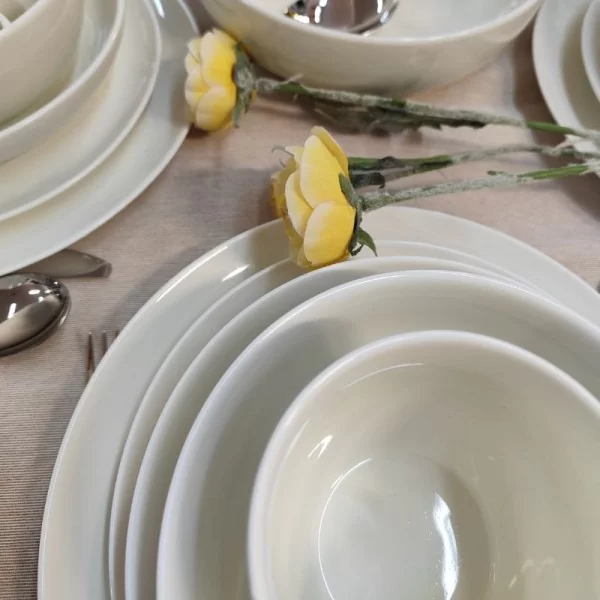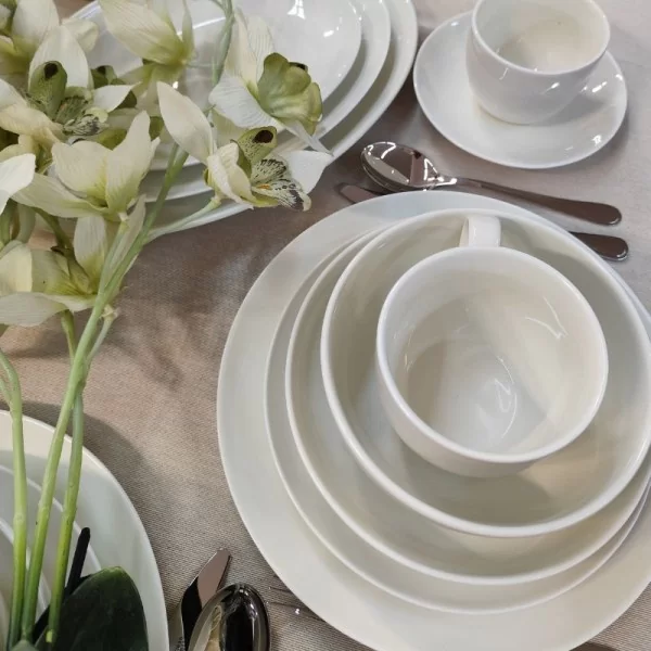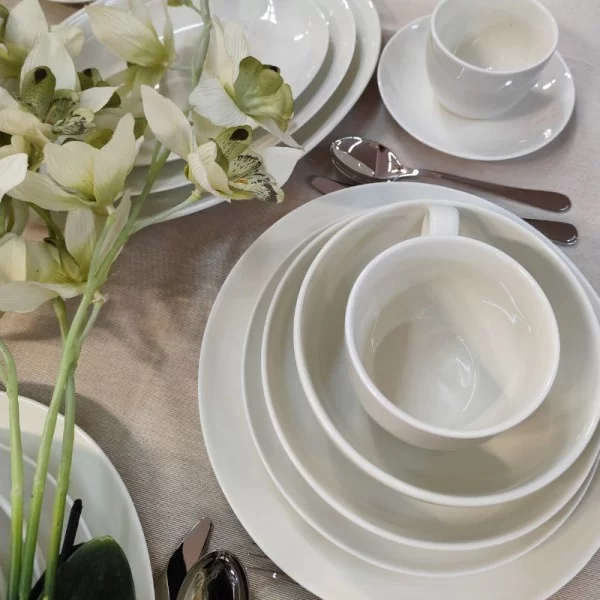 Gładka, lśniąca powierzchnia porcelany podkreśla jej wysoką jakość i doskonale komponuje się z innymi dekoracjami marki Bogucice. Serwis obiadowy Base Cream to porcelana odporna na intensywne użytkowanie, przystosowana do mycia w zmywarce oraz użycia w kuchence mikrofalowej dzięki temu idealnie sprawdzi się w gastronomii jak i w domowych warunkach.