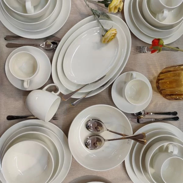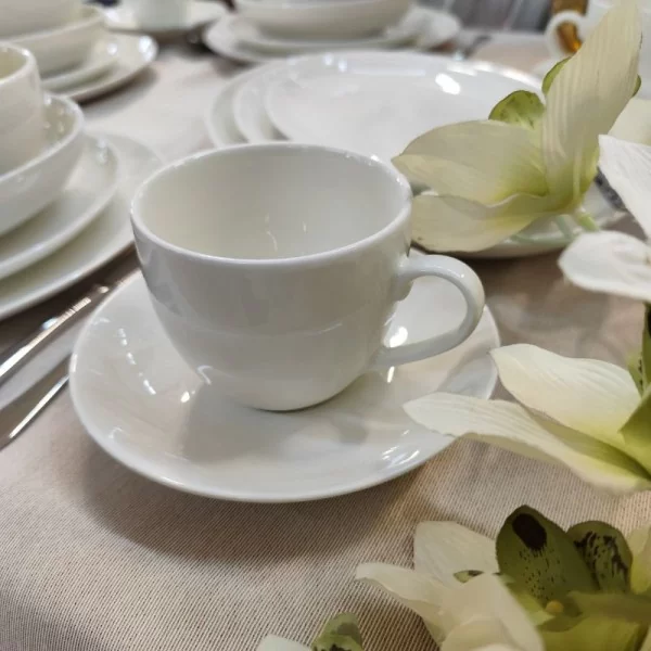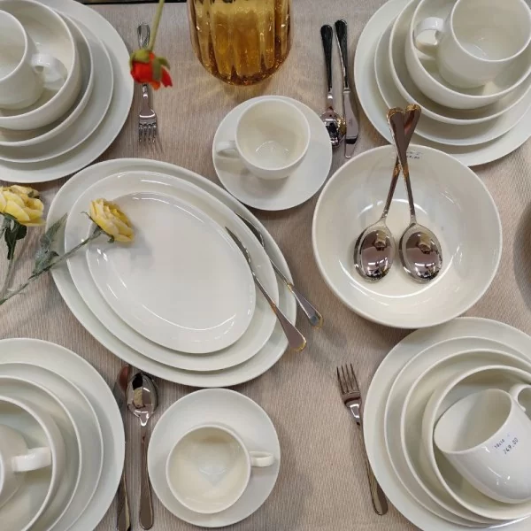 Base Cream 1232 od Bogucic to nowoczesny, uniwersalny fason. Serwis obiadowy dla 6 osób składający się z 42 elementów. Wyróżnia go delikatny, kremowy odcień ecru, który nadaje zastawie ciepły i przytulny charakter, idealnie komponujący się zarówno z nowoczesnymi, jak i klasycznymi aranżacjami stołu.