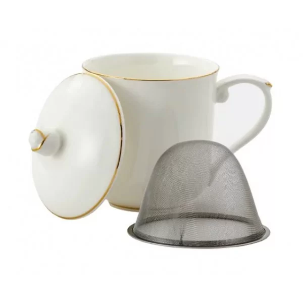Porcelanowy kubek o pojemności 350 ml z zaparzaczem i przykrywką. W zestawie znajduje się stalowy zaparzacz do herbaty liściastej, który umożliwia wygodne parzenie ulubionych naparów bez fusów. Praktyczna pokrywka nie tylko utrzymuje ciepło napoju, ale może również służyć jako podstawka pod zaparzacz po jego wyjęciu.