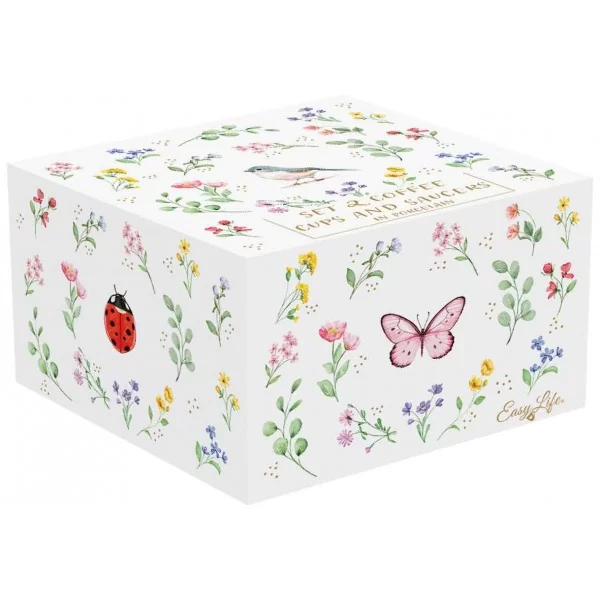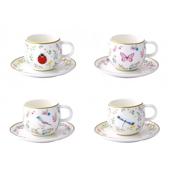 Zestaw 2 filiżanek do kawy ze spodkiem "Fancy Garden", z tłoczonym wzorem, wykonany z porcelany, o indywidualnej pojemności 120 ml. Produkt dostępny w 2 różnych kombinacjach: zestaw biedronka + motyl, zestaw wróbel + ważka.