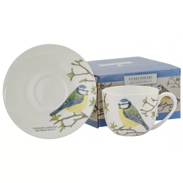 Filiżanka o pojemności 300 ml ze spodkiem 15 cm z serii Ptaki Polski by Agata Hajdecka. Wykonana z najwyższej jakości porcelany. Zestaw ozdobiony motywem Modraszki na białym tle. Wzory ptaków zostały wykonane przez polską projektantkę graficzną i ilustratorkę Agatę Hajdecka, laureatkę wielu ogólnopolskich konkursów plastycznych. Inspiracje do cyklu ptasich ilustracji zostały zaczerpnięte ze starych rycin książkowych.