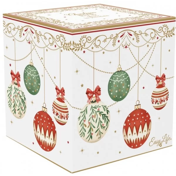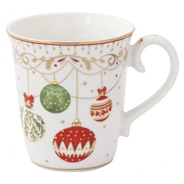 Porcelanowy kubek ze świątecznym motywem bombek o pojemności 270 ml. Zapakowany w ozdobne pudełko idealnie sprawdzi się jako upominek pod choinkę.