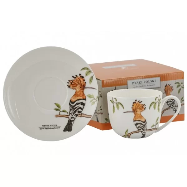 Filiżanka o pojemności 280 ml ze spodkiem z serii Ptaki Polski by Agata Hajdecka. Wykonana z najwyższej jakości porcelany. Zestaw ozdobiony motywem Dudka na białym tle.