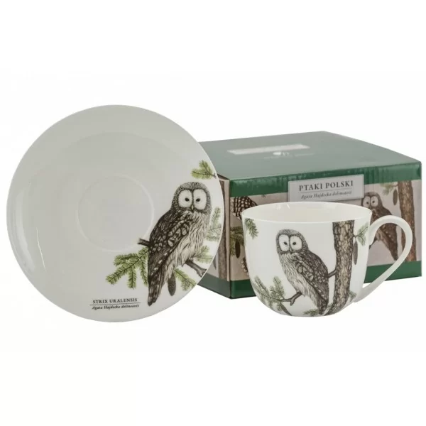 Filiżanka o pojemności 280 ml ze spodkiem z serii Ptaki Polski by Agata Hajdecka. Wykonana z najwyższej jakości porcelany. Zestaw ozdobiony motywem Puszczyka na białym tle.