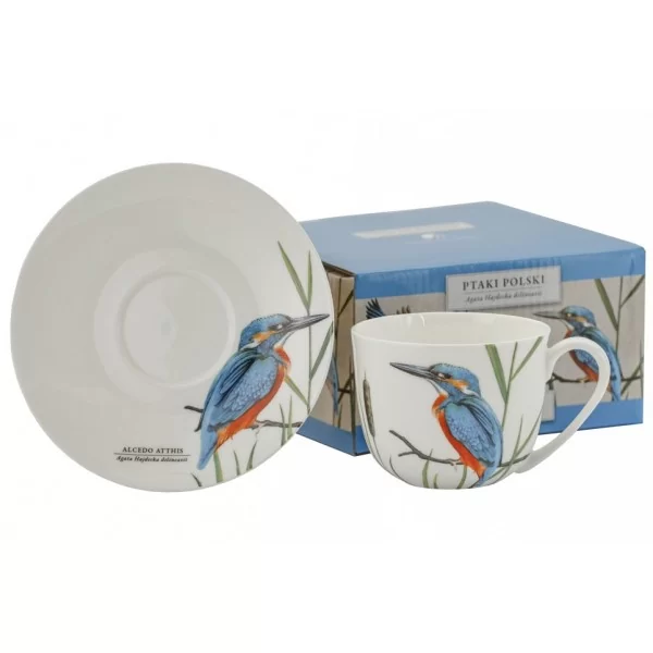Filiżanka o pojemności 280 ml ze spodkiem z serii Ptaki Polski by Agata Hajdecka. Wykonana z najwyższej jakości porcelany. Zestaw ozdobiony motywem Zimorodka na białym tle.
