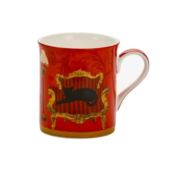 Kubek o pojemności 300 ml wykonany z wysokiej jakości porcelany, ozdobiony kolorowym motywem kota na fotelu. W zestawie znajduje się łyżeczka dopasowana do kubka. Idealny na prezent lub do codziennego użytku, wprowadza radosny i uroczy akcent.