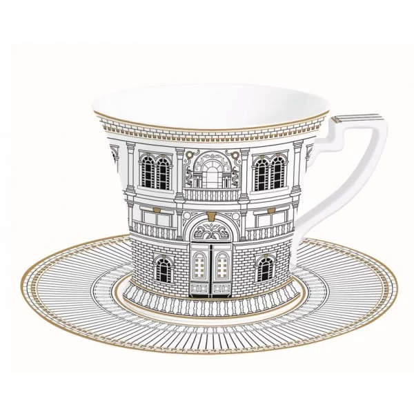 Seria porcelany kostnej Palazzo utrzymana jest w kolorystyce biało-czarnej ze złotymi zdobieniami. Pojemność: Filiżanka ma pojemność 200 ml, co sprawia, że jest idealna do serwowania kawy, herbaty lub innych napojów. Jej pojemność jest odpowiednia zarówno na poranną kawę, jak i na popołudniową herbatę.