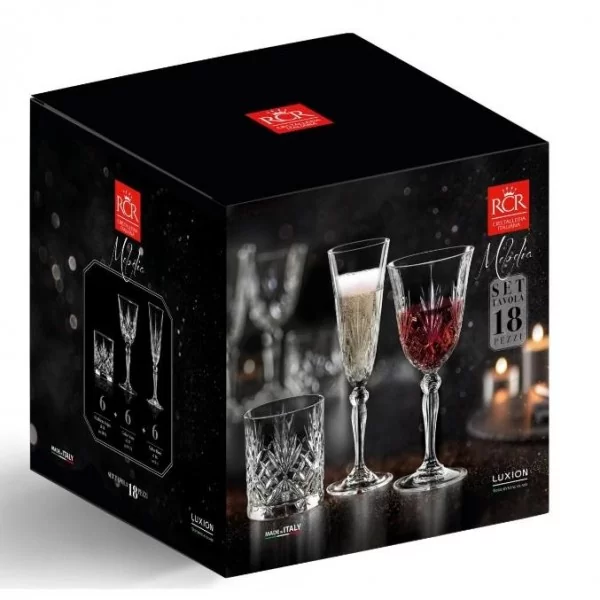 18-elementowy zestaw kieliszków i szklanek został wykonany z wysokiej jakości szkła kryształowego, ekologicznego (w 100% nadaje się recyklingu). Szkło kryształowe marki RCR jest idealnie przejrzyste, wyjątkowo błyszczy i wydaje przyjemne dźwięki np. podczas toastu. Zestaw zawiera 18 elementów: 6 kieliszków do wody lub wina, 6 kieliszków do szampana oraz 6 szklanek do whisky. Komplet jest idealnym prezentem na wyjątkowe okazje np. ślub, rocznica czy urodziny.