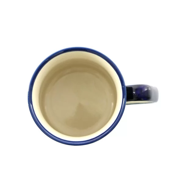 Ceramiczny kubek o pojemności 250 ml, dekorowany ręcznie metodą stempelkową motywem w barwach kobaltu i błękitu. Kolekcja 166A Zakładów Ceramicznych Bolesławiec.