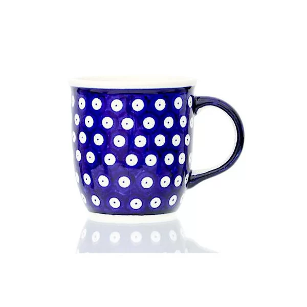 Ceramiczny kubek o pojemności 350 ml, dekorowany ręcznie metodą stempelkową, motywem w kolorach kobaltu.Kolekcja 42 Kropki Zakładów Ceramicznych Bolesławiec.