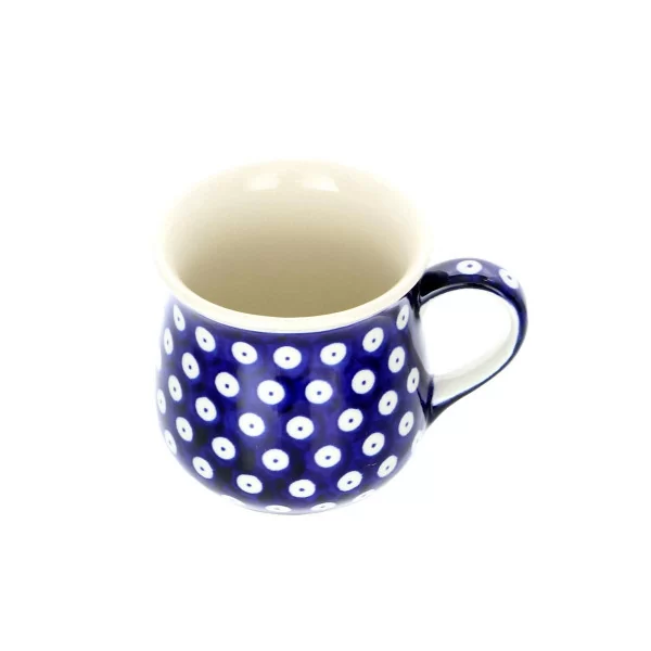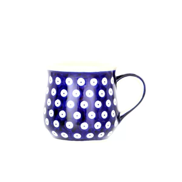 Ceramiczny kubek o pojemności 250 ml, dekorowany ręcznie metodą stempelkową, motywem w kolorach kobaltu. Kolekcja 42 Kropki Zakładów Ceramicznych Bolesławiec.