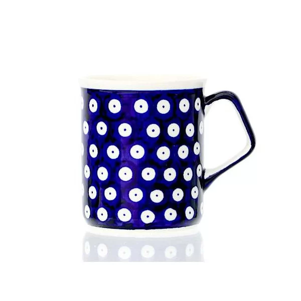Ceramiczny kubek o pojemności 250 ml, dekorowany ręcznie metodą stempelkową, motywem w kolorach kobaltu. Kolekcja 42 Kropki Zakładów Ceramicznych Bolesławiec.