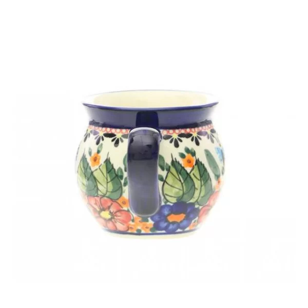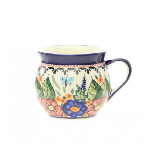 Ceramiczny kubek o kształcie beczułki i pojemności 320 ml, dekorowany ręcznie. Kolekcja ART Zakładów Ceramicznych Bolesławiec.