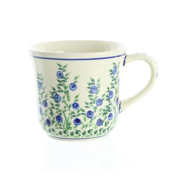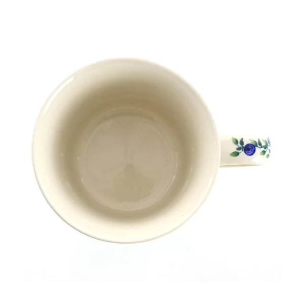 Ceramiczny kubek o pojemności 500 ml, dekorowany ręcznie metodą stempelkową motywem jagód. Kolekcja Jagody Zakładów Ceramicznych Bolesławiec.
