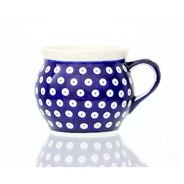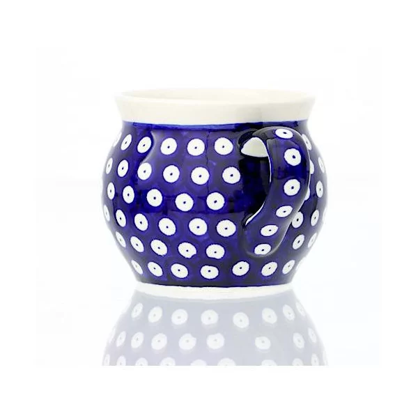 Ceramiczny kubek beczułka o pojemności 420 ml, dekorowany ręcznie metodą stempelkową, motywem w kolorach kobaltu. Kolekcja 42 Kropki Zakładów Ceramicznych Bolesławiec.