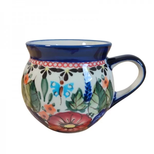 Ceramiczny kubek od Zakładów Ceramicznych Bolesławiec, w dekoracji artystycznej. Charakteryzuje się większą, niż pozostałe dekoracje, ilością wzorów i kolorów. W przypadku tej dekoracji mamy motyle latające nad łąką oraz dopełnienie w postaci różnorodnych wzorów dookoła naczynia.