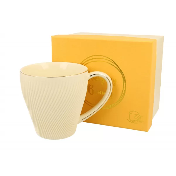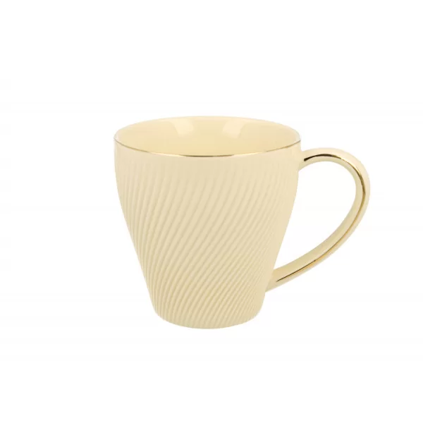 Porcelanowy kubek, o pojemności 430 ml. Kubek wykonany jest z porcelany w kolorze śmietankowym z lekkimi złotymi zdobieniami na rańcie.