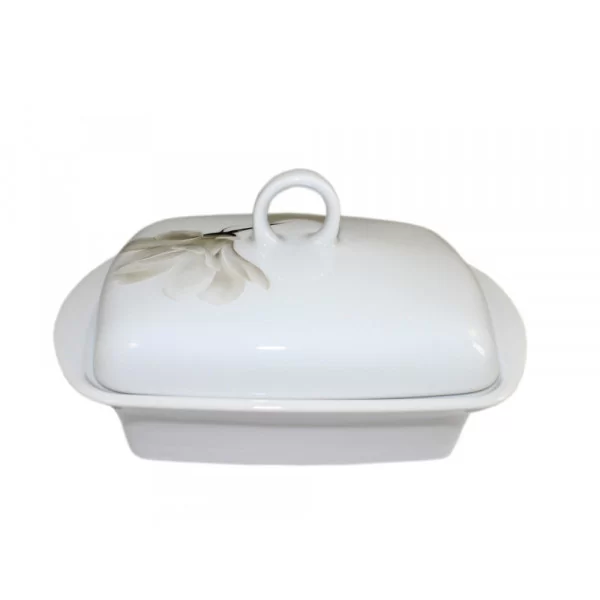 Maselnica z motywem magnolii. Porcelana biała. Producent Lubiana, dekoracja nr 6474.