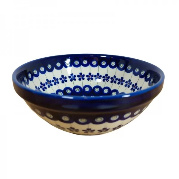 Miska ceramiczna od Zakładów Ceramicznych Bolesławiec, w dekoracji o podwyższonym standardzie. Charakteryzuje się ona dużą ilością kobaltowych kółek w pawim okiem w środku oraz kwiatkami przypominającymi goździki.