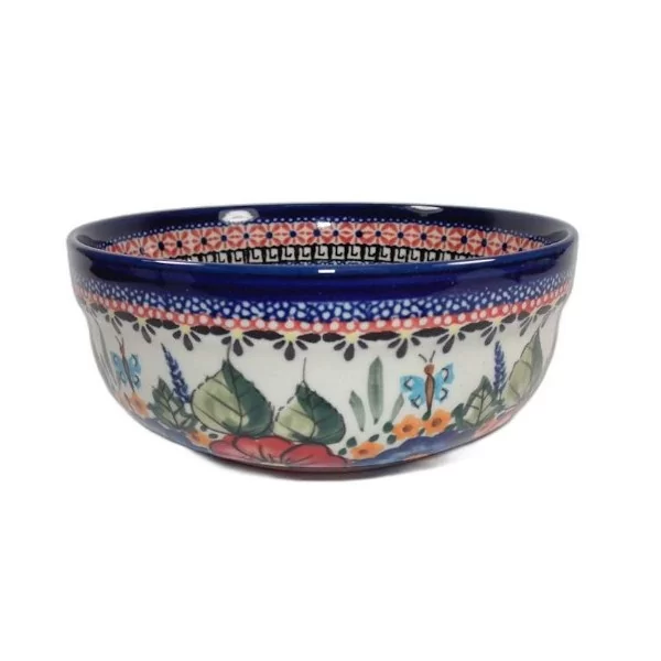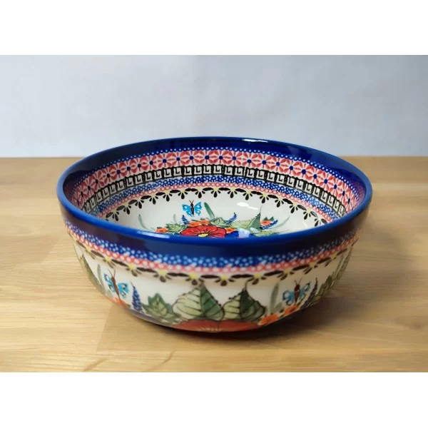 Ceramiczna miska od Zakładów Ceramicznych Bolesławiec, w dekoracji artystycznej. Charakteryzuje się większą, niż pozostałe dekoracje, ilością wzorów i kolorów. W przypadku tej dekoracji mamy motyle latające nad łąką oraz dopełnienie w postaci różnorodnych wzorów dookoła naczynia.