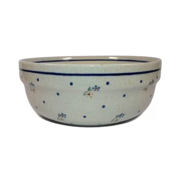 Miska ceramiczna od Zakładów Ceramicznych Bolesławiec w klasycznej dekoracji 111. Charakteryzuje się ona drobniutkimi kwiatkami, kobaltowymi kropkami oraz paskami na obrzeżach. Miska sprawdzi się jako ozdoba jak i również na np. słodycze.