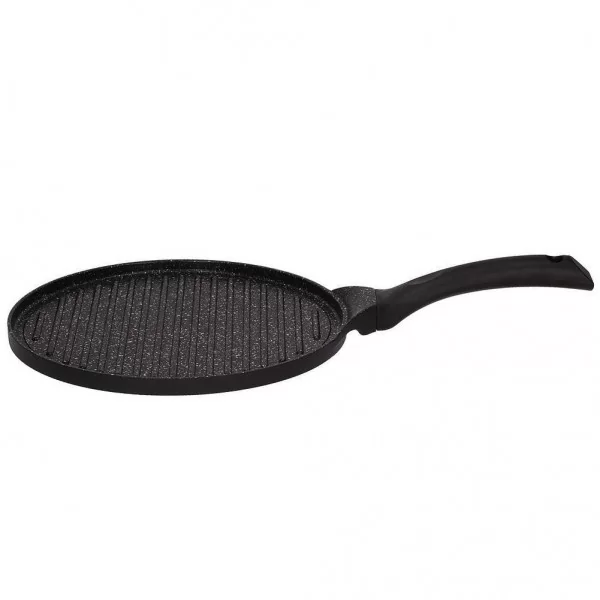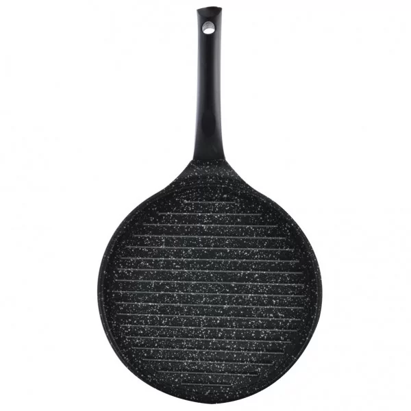 Okrągła patelnia grillowa wykonana z odlewu aluminiowego, o średnicy 27 cm.