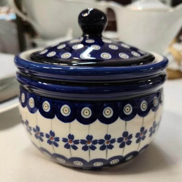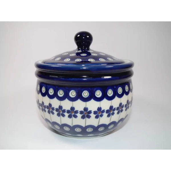 Ceramiczny pojemnik do przechowywania o pojemności 750 ml, dekorowany ręcznie metodą stempelkową motywem w barwach kobaltu i błękitu od Zakładów Ceramicznych Bolesławiec.